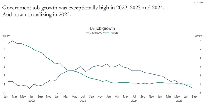 De Amerikaanse arbeidsmarkt begint duidelijke tekenen van afkoeling te vertonen. Volgens hoofdeconoom Torsten Sløk van Apollo, in zijn recente analyse The Daily Spark, zijn er voor het eerst sinds 2021 meer werklozen (7,4 miljoen) dan openstaande vacatures (7,2 miljoen). Vooral sectoren die gevoelig zijn voor importtarieven en hogere financieringskosten, zoals industrie, bouw en logistiek, laten een terugval in werkgelegenheid zien. Tegelijkertijd dalen verschillende vertrouwensindicatoren onder consumenten, vooral bij lagere inkomens en de middenklasse, én onder kleine bedrijven. Dat wijst op een verdere vertraging van de banengroei en een geleidelijke normalisatie van de looninflatie.