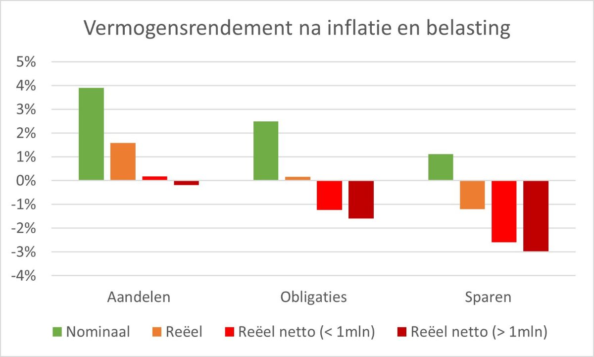 De discussie haakt aan bij een eerdere analyse van David Blitz (Robeco), die een jaar geleden al soortgelijke conclusies trok. Blitz wees erop dat het reële rendement sinds de start van de euro (1999) voor obligaties praktisch nul is, en voor spaargeld duidelijk negatief. Zelfs aandelen, normaal gesproken de beste bescherming tegen inflatie, leveren na belasting nauwelijks meerwaarde op. Zijn suggestie: belast niet het nominale rendement, maar de winst na correctie voor inflatie. Dat zou de belastingdruk eerlijker verdelen en sparen en beleggen weer aantrekkelijk maken.