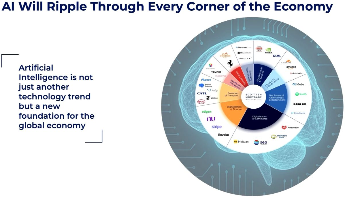 Scottish Mortgage Trust ziet AI als het fundament voor een nieuw economisch tijdperk en investeert in de hele keten, inclusief de nieuwe positie Anthropic. De holding blijft langetermijngericht en herinvesteert de opbrengsten van afgebouwde posities zoals NVIDIA en Tesla in de volgende generatie "onvermijdelijke" groeibedrijven.