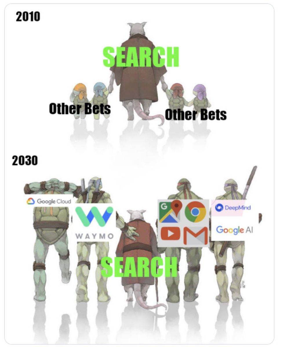 De illustratie van @wintermoat op X vat het mooi samen: waar Search in 2010 nog de ‘vaderfiguur’ was van kleine experimentele “Other Bets”, zijn die kinderen inmiddels opgegroeid tot volwassen pijlers. In Q3 kwam $56,6 miljard uit Search, $15,2 miljard uit Cloud, $12,9 miljard uit abonnementen en apparaten, en $10,3 miljard uit YouTube-advertenties.