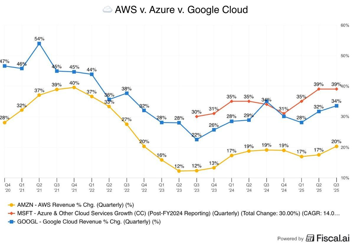 Ook de concurrentie rapporteerde sterke resultaten. Zowel Microsoft Azure als Amazon Web Services (AWS) zagen hun cloudomzet verder toenemen met respectievelijk 39% en 20% groei op jaarbasis. Daarmee blijft Microsoft voorlopig de marktleider, met de grootste omzetbasis én het hoogste groeitempo binnen de sector.
