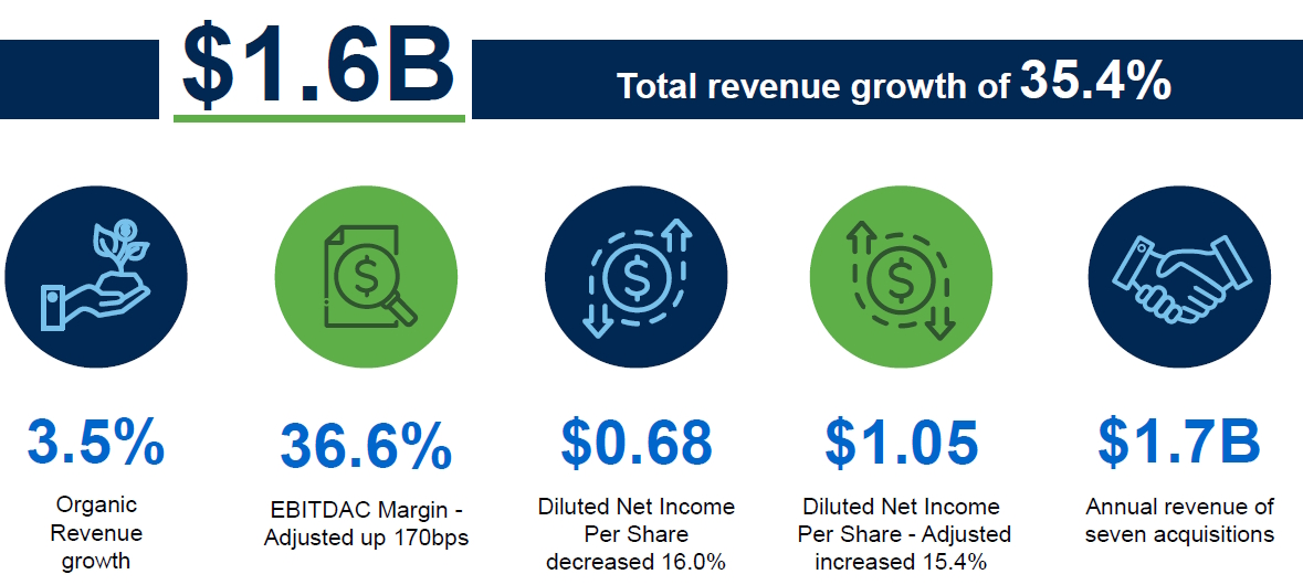 Oppervlakkig bezien leken de resultaten voor het derde kwartaal robuust. De totale omzet kende een sprong van 35,4% naar USD 1,6 miljard. De winst per aandeel steeg eveneens met 15,4% naar USD 1,05. Nog indrukwekkender was de operationele winstmarge. Deze breidde uit met 170 basispunten naar 36,6%. Deze aanzienlijke omzetgroei was grotendeels het resultaat van M&A-activiteit, met name de recente grote acquisitie van Accession. De onderliggende organische omzetgroei bleef steken op een bescheiden 3,5%.