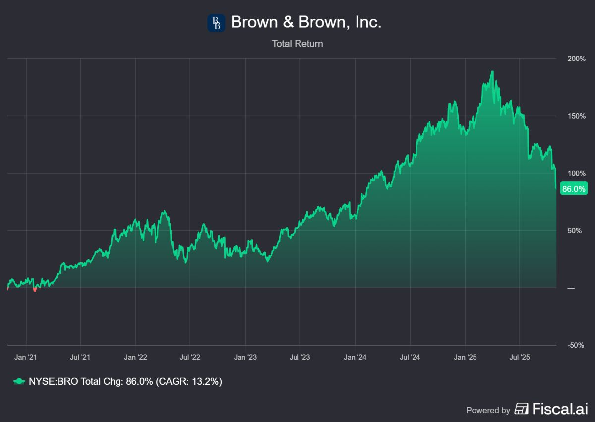 Brown & Brown rapporteerde een omzetgroei van 35,4% in Q3, gedreven door overnames, maar het aandeel daalde 8% door een zwakke Q4-prognose. De teleurstellende outlook wordt veroorzaakt door een verwachte organische krimp van 4-6% in de belangrijke Specialty Distribution-divisie.