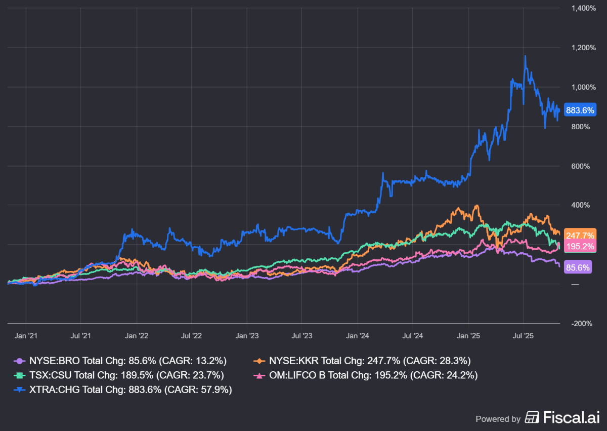 Brown & Brown, KKR, Constellation Software, Lifco en Chapters Group zijn de handelsweek aan de beurzen van New York, Toronto, Stockholm en Frankfurt geëindigd op koersen van respectievelijk USD 79,74, USD 118,33, CAD 3.691,08, SEK 368,20 en EUR 37,50 per aandeel.