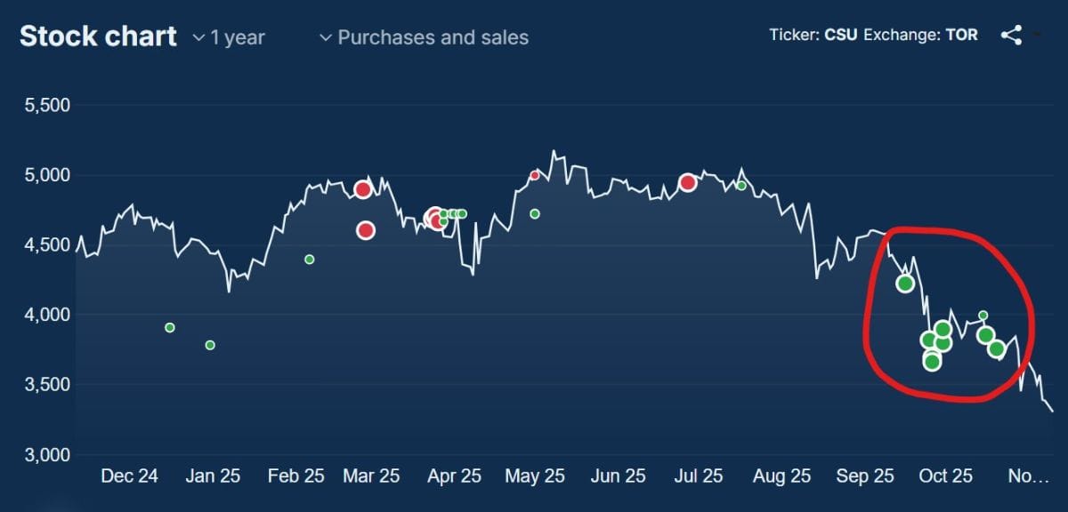 Onder andere de nieuwe CEO Mark Miller, die onlangs de met gezondheidsproblemen kampende oprichter Mark Leonard opvolgde, kocht voor CAD 1 miljoen aandelen. In totaal kochten insiders voor meer dan CAD 2,4 miljoen eigen aandelen in.