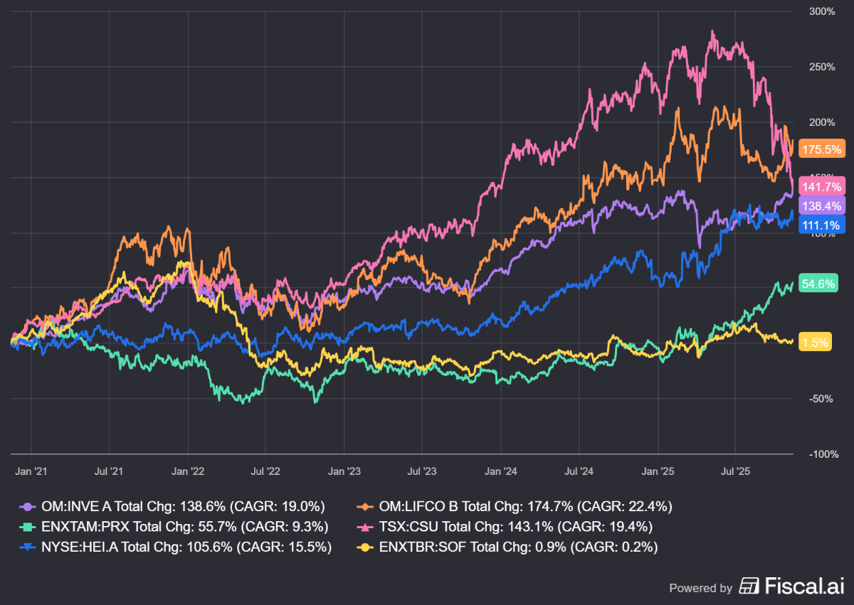 Investor AB, Lifco, Prosus, Constellation Software, HEICO en Sofina worden momenteel aan de beurzen van Stockholm, Amsterdam, Toronto, New York en Brussel verhandeld op koersen van respectievelijk SEK 319,10, SEK 353,40, EUR 60,74, CAD 3.341,65, USD 246,72 en EUR 241 per aandeel.