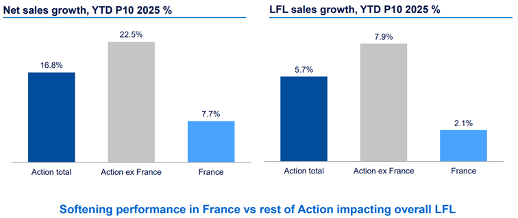 Frankrijk, goed voor ongeveer een derde van de totale omzet van Action, vormt op dit moment de grootste bron van tegenwind. De combinatie van politieke onrust, een structureel zwakke economie, hoge schulden en dalend consumentenvertrouwen zet druk op de verkoopdynamiek binnen het land. Waar Action buiten Frankrijk een indrukwekkende omzetgroei van 22,5% realiseerde, bleef Frankrijk steken op slechts 7,7%. In oktober werd de druk nog duidelijker zichtbaar: de like-for-like omzetgroei in Frankrijk draaide licht negatief en noteert daarmee year-to-date een magere groei van 2,1%.