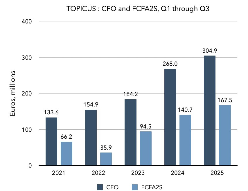 In het derde kwartaal groeide de omzet van Topicus met 24%, waarvan 3% organische groei betrof. De belangrijkste omzetcomponent, de wederkerige onderhoudsomzet, vertoonde een sterke autonome groei van 6%. De operationele kasstroom (CFO) steeg met een spectaculaire 53%. In bovenstaande figuur kunt u de ontwikkeling van de kasstroom in de eerste negen maanden van 2021 tot en met 2025 bekijken. De operationele kasstroom groeide jaarlijks met een samengesteld percentage van bijna 23%.