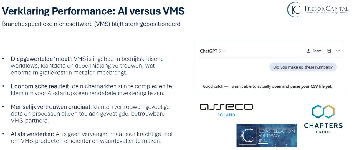Wij beschouwen AI niet als existentiële bedreiging voor branchespecifieke software, omdat deze software diep verankerd is in bedrijfskritische functies met hoge overstapkosten. Factoren zoals het opgebouwde klantvertrouwen, diepe sectorkennis en de economische onhaalbaarheid om talloze kleine niches aan te vallen, creëren een robuuste verdedigingslinie. Wij denken juist dat AI een krachtig hulpmiddel voor efficiëntie en nieuwe waardecreatie binnen de bestaande software kan dienen, niet als een vervanging ervan.