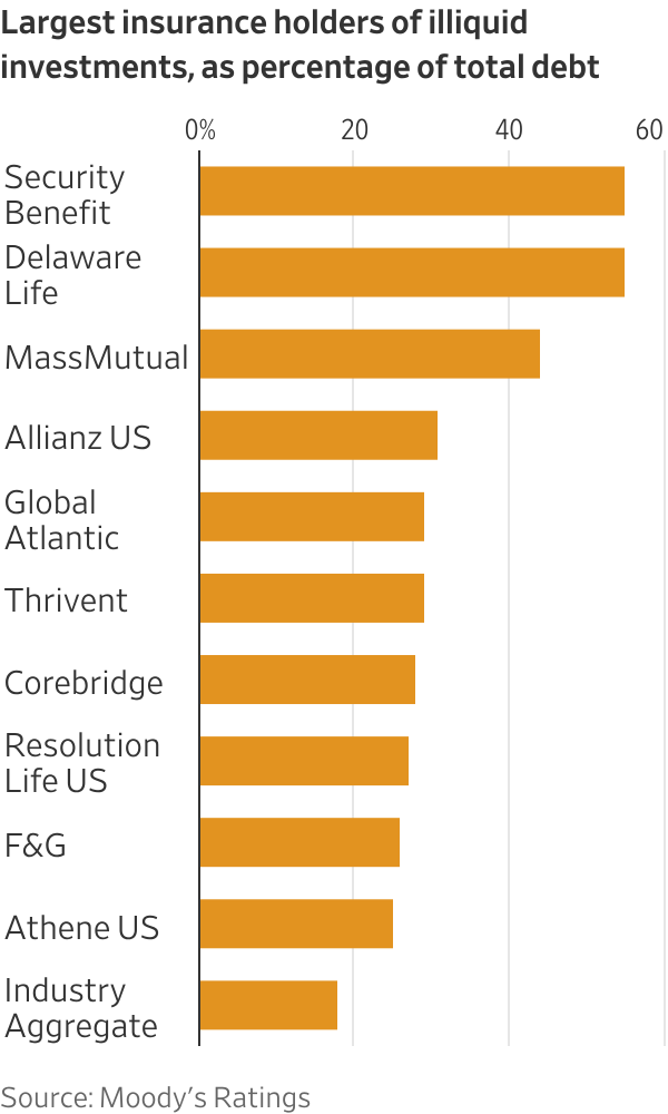 Voor traditionele verzekeraars betekent dat vooral: kopen wat de markt aanbiedt. Voor KKR ligt dat anders. Via dochterbedrijf Global Atlantic kan het bedrijf private-creditleningen zelf origineren, met betere voorwaarden, hogere spreads en een directere koppeling tussen risico en rendement. In de bijgaande grafiek is te zien dat Global Atlantic, KKR’s verzekeringsdochter, tot de grootste houders van illiquide private-creditbeleggingen behoort. Alleen partijen als Security Benefit en Delaware Life zitten hoger. Dit is belangrijk omdat deze beleggingen doorgaans hogere rendementen bieden, maar ook meer expertise vereisen. Dat levert: